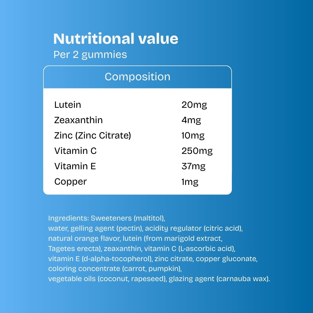 Lutein (from marigold extract, Tagetes erecta ), Zeaxanthin, Vitamin C (L-ascorbic acid), Vitamin E (D-α-tocopheryl acetate), Zinc citrate, Vitamin A (retinyl acetate), Selenium-enriched yeast, colouring concentrate (carrot, pumpkin), vegetable oils (coconut, rapeseed), glazing agent (carnauba wax), water, sweeteners (maltitol, xylitol syrup, sorbitol), gelling agent (pectin), acidity regulator (citric acid), natural flavouring (orange)
